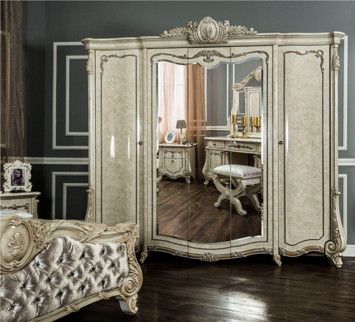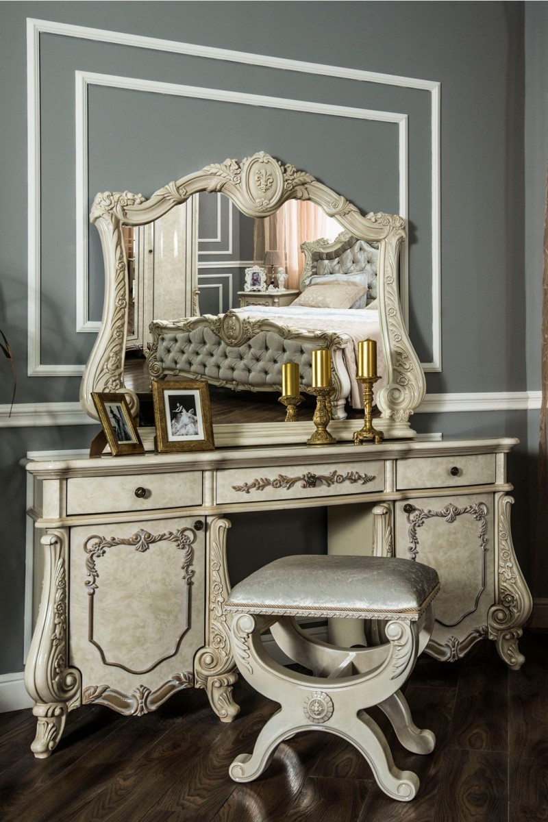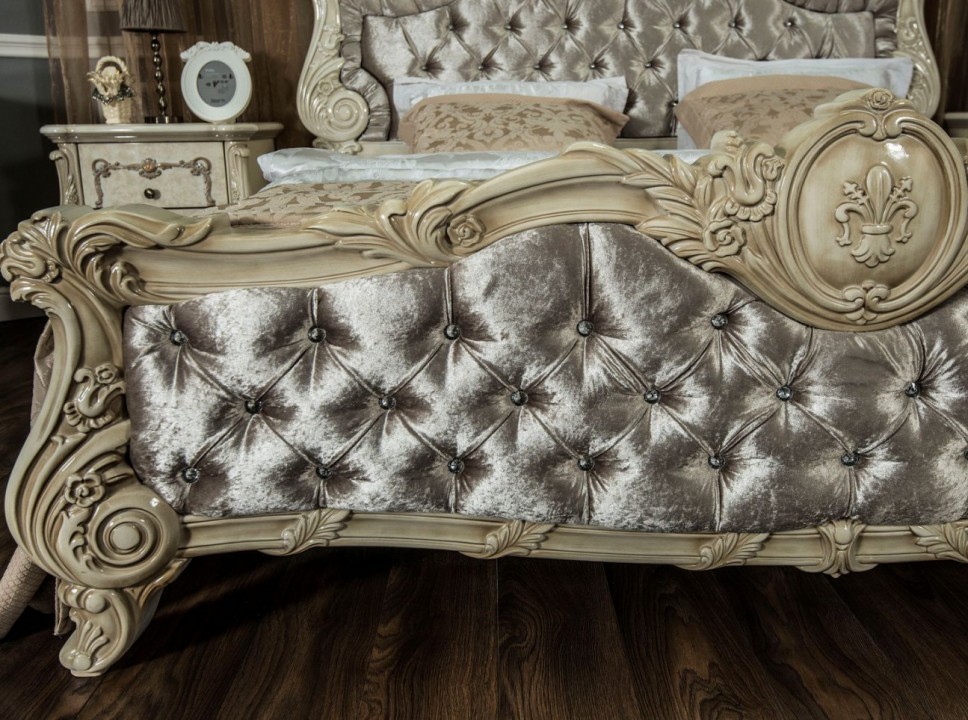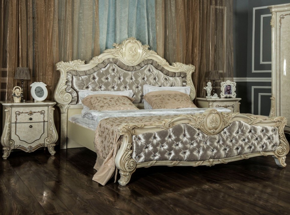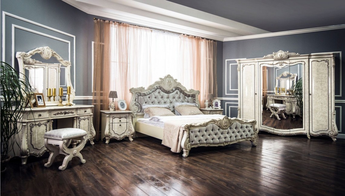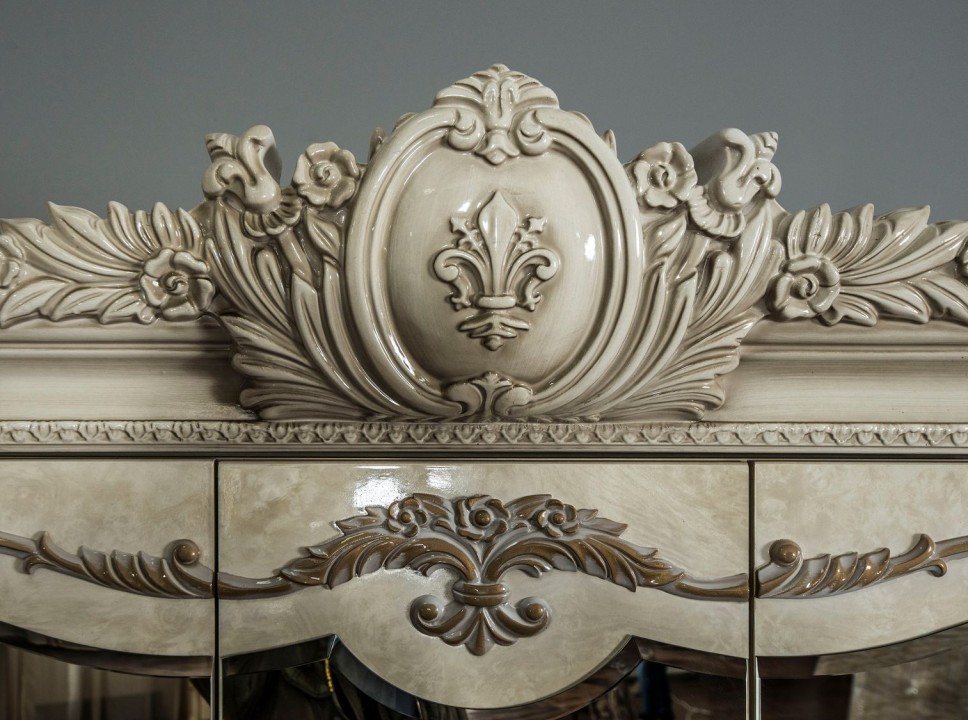 Коллекция «Марселла» поистине королевская спальня эпохи Людовика XIV. Все элементы декора, гербы, фестоны, ленты, лавры, линии и пышные завитки выполнены с поразительной точностью и изяществом. Данная мебель перенесет Вас в эпоху царского Версаля.