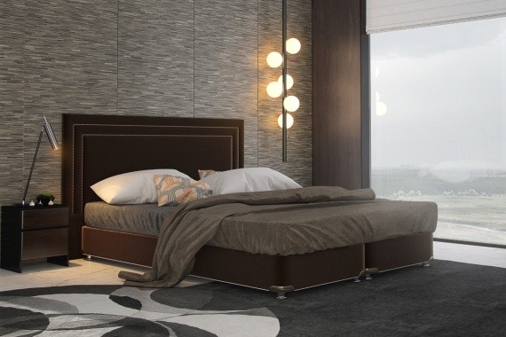 Это изголовье, которое имеет характер. Оно было бы простым и строгим, если бы не оригинальная отделка — два ряда металлических клепок, расположенных по всему периметру. Эта стильная деталь притягивает взгляд, создает намек на благородную роскошь, которой не нужно быть слишком броской, чтобы подчеркивать вкус своего обладателя.