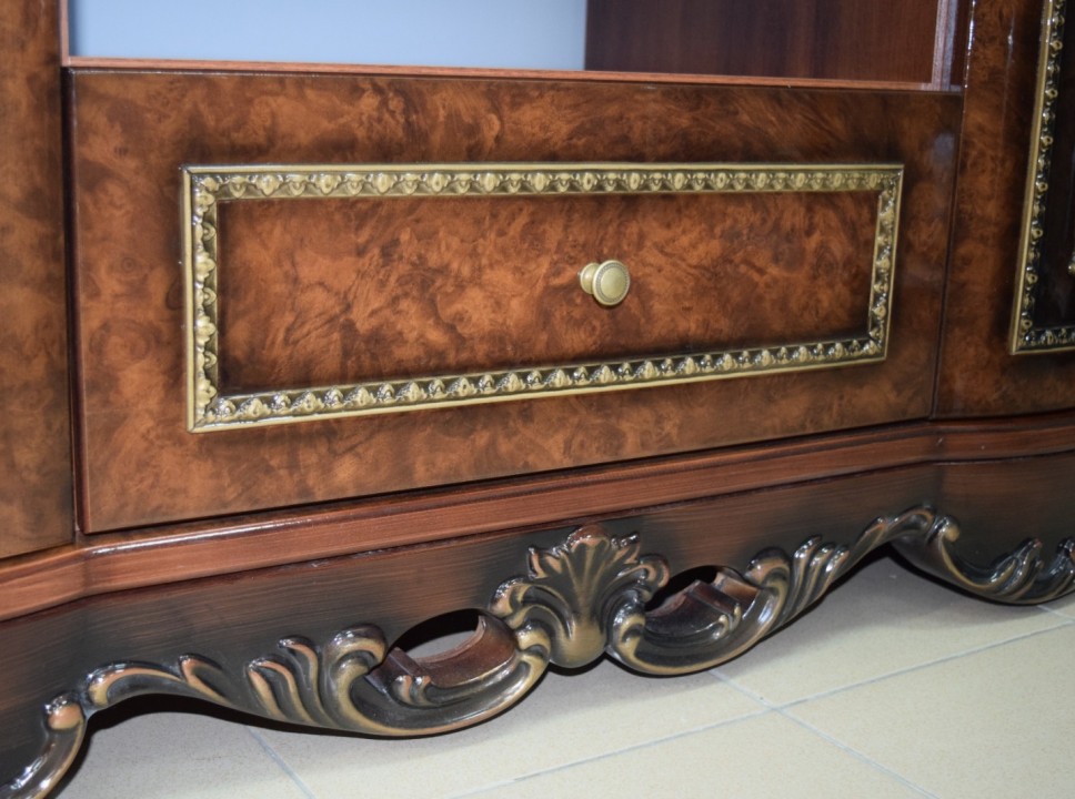Декоративные элементы, фасады, накладки покрыты темной и золотой патиной и матовым лаком или глянцевым лаком на водной основе