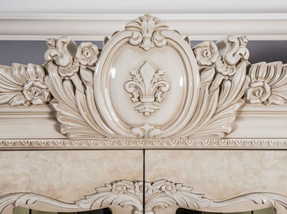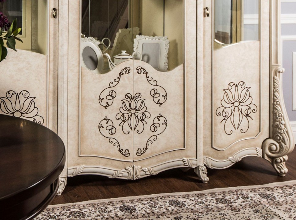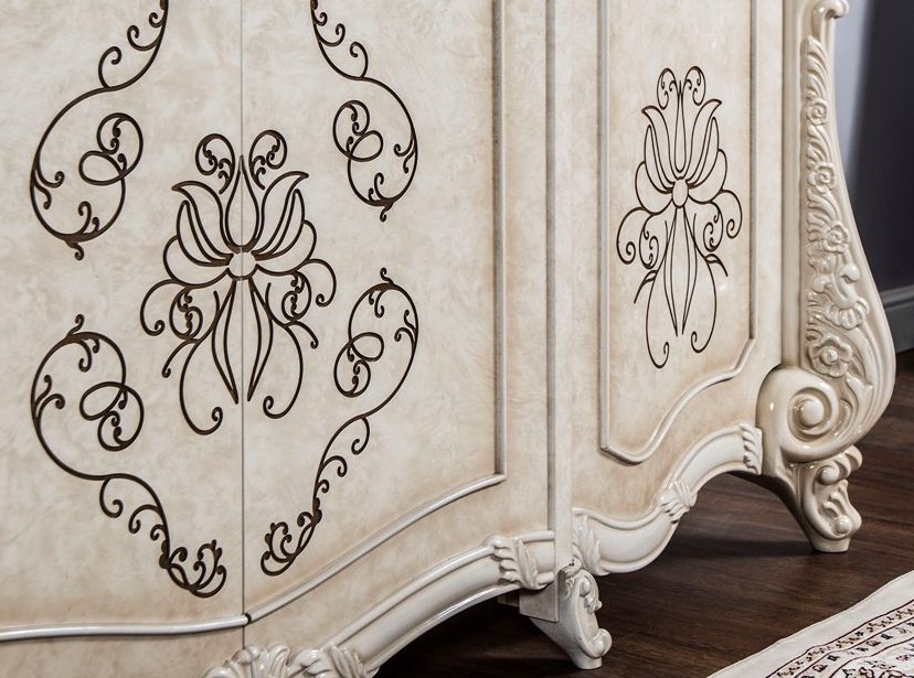 Декоративные элементы, фасады, накладки покрыты золотой, темной патиной и глянцевым лаком на водной основе