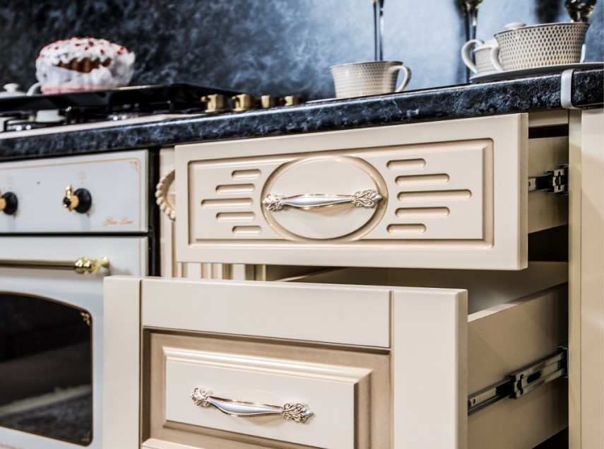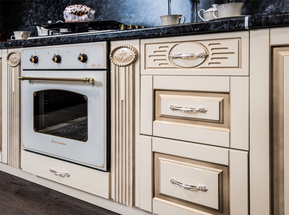 Декоративные элементы, фасады, накладки окрыты темной патиной и матовым лаком на водной основе