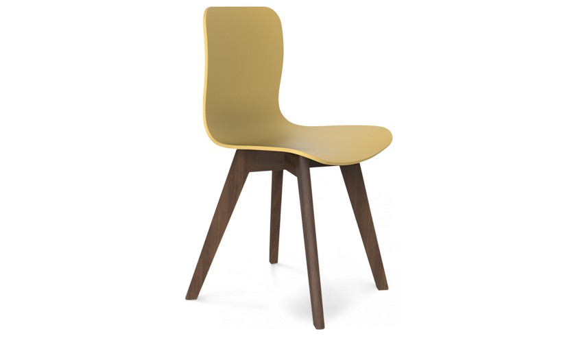 Удобный пластиковый стул на деревянных ножках;
