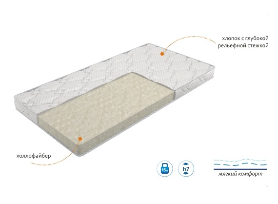 Беспружинный матрас средней жесткости для малышей в возрасте до трех лет. В качестве основы используется гипоаллергенный материал - холлофайбер. Способный быстро испарять влагу и не сохраняет запахи.